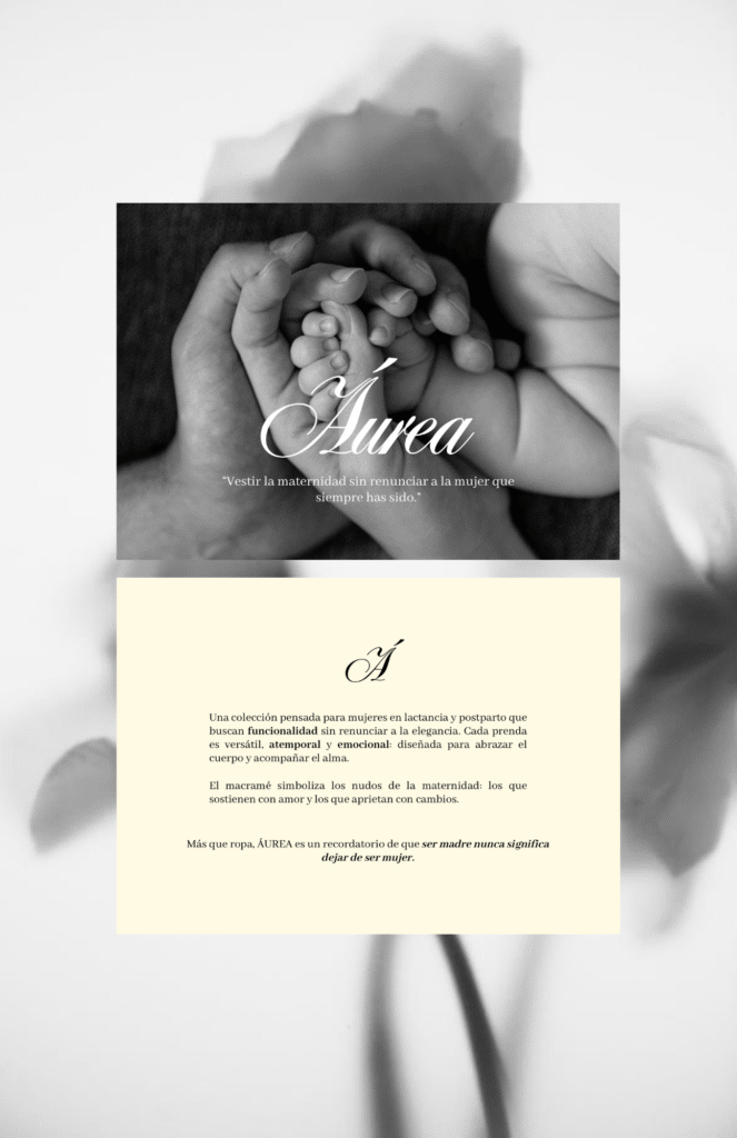 “Áurea” surge de la intención de crear un puente entre la maternidad y la feminidad, respondiendo a una necesidad poco atendida en la moda: vestir a las mujeres en el postparto y lactancia sin que pierdan su estilo, seguridad o elegancia. La colección explora la dualidad entre lo funcional y lo estético, entre la mujer que es madre y la mujer que sigue siendo ella misma, a través de prendas atemporales, sofisticadas y versátiles que acompañan cada etapa de su vida.